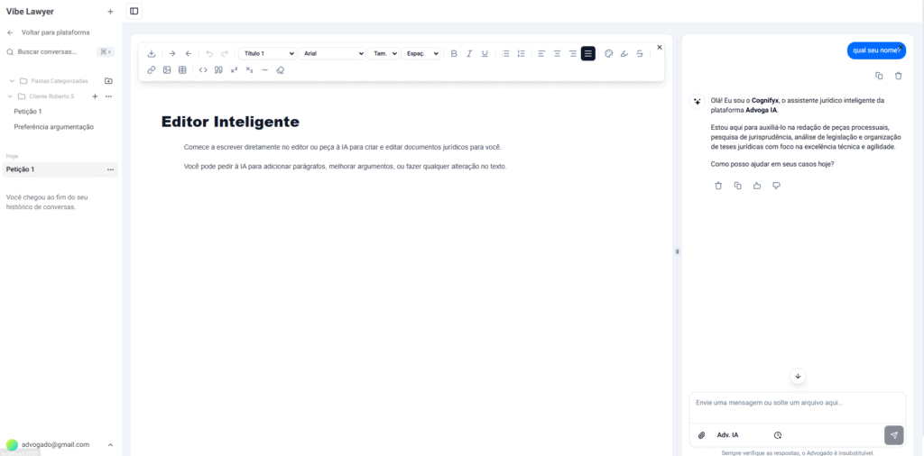 Resumindo, o Vibe Lawyer transforma o Advoga IA em uma plataforma completa com Chat + Editor, Gestão por Pastas, Oráculo Integrado e Controle Total das alterações.